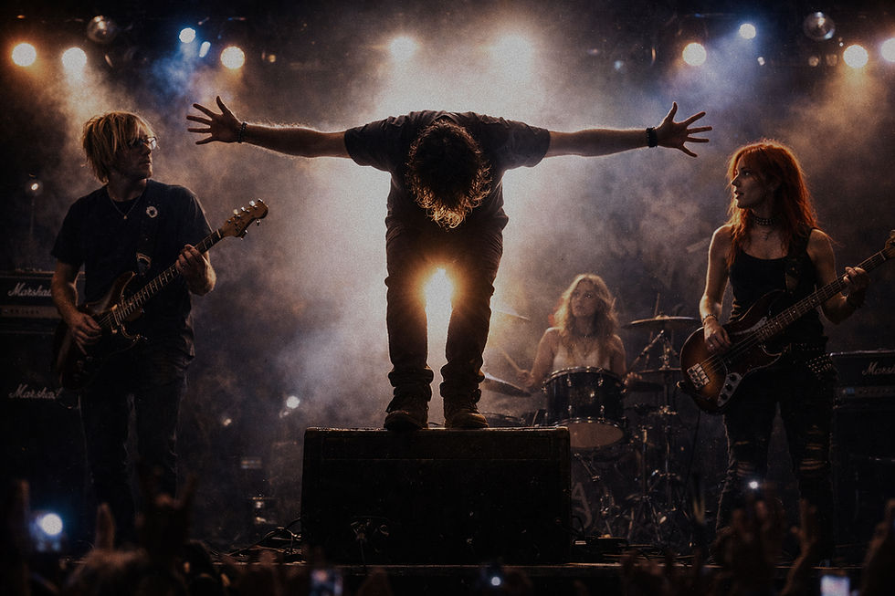 We waved and walked to the front of the stage. We were shaking, as if we’d exhaled the entire concert. Roxy’s eyes were wet. Mine too. Cayde and Nova held it together—either stronger or better at hiding it. We turned to face each other, pressed our foreheads together, and took a great collective breath, as if trying to both survive and memorize the moment. Then we threw our arms around one another.